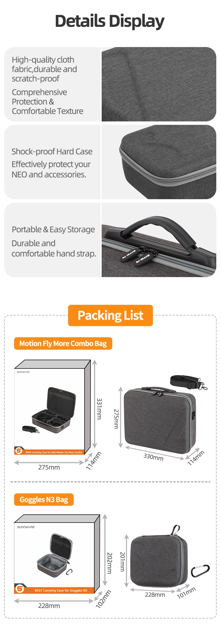 - Mini Case & Large Capacity: it can hold NEO, battery charging hub, 4 batteries (including one in drone and three in the hub), RC Motion 3, Goggles N3 and accessories like lens filter, spare propellers, screwdriver and charge cables, etc.