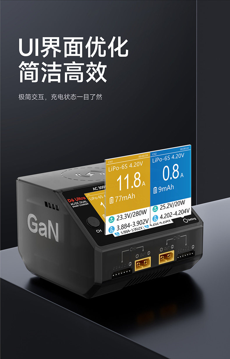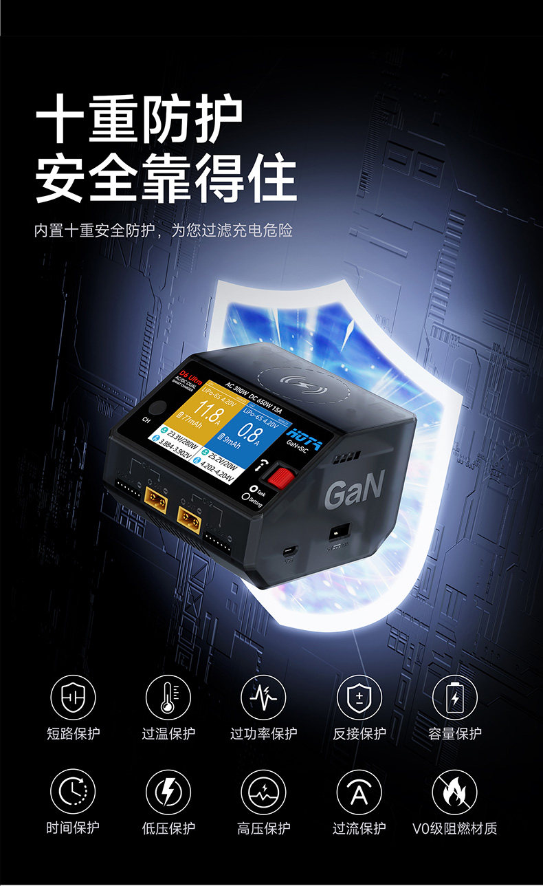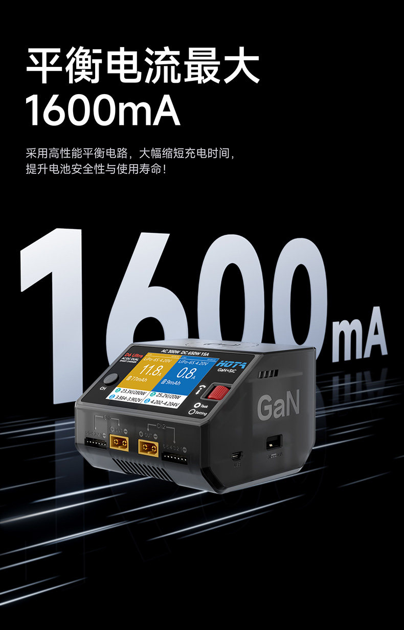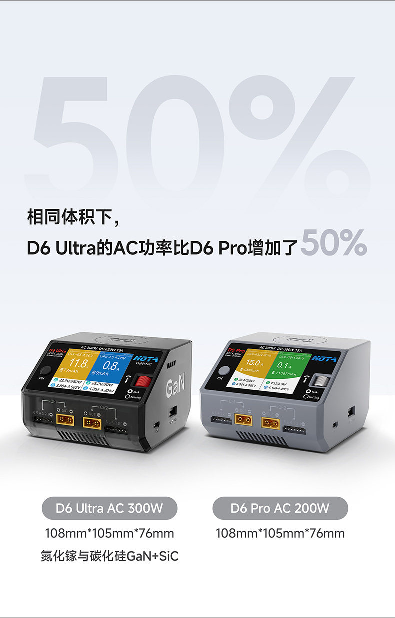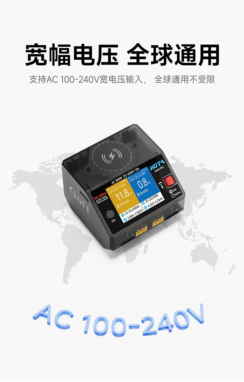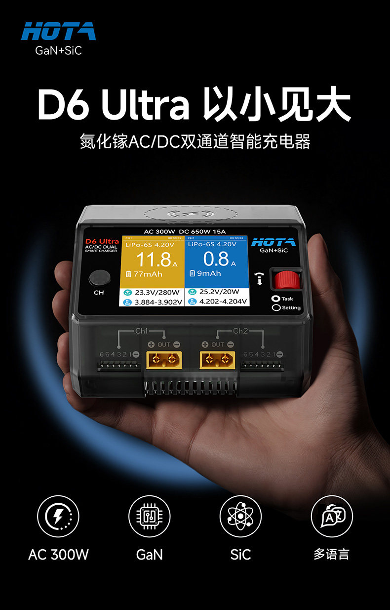 HOTA D6 Ultra 氮化鎵AC/DC AC 300W DC 650W15A雙通道智慧充電器 (透黑)
