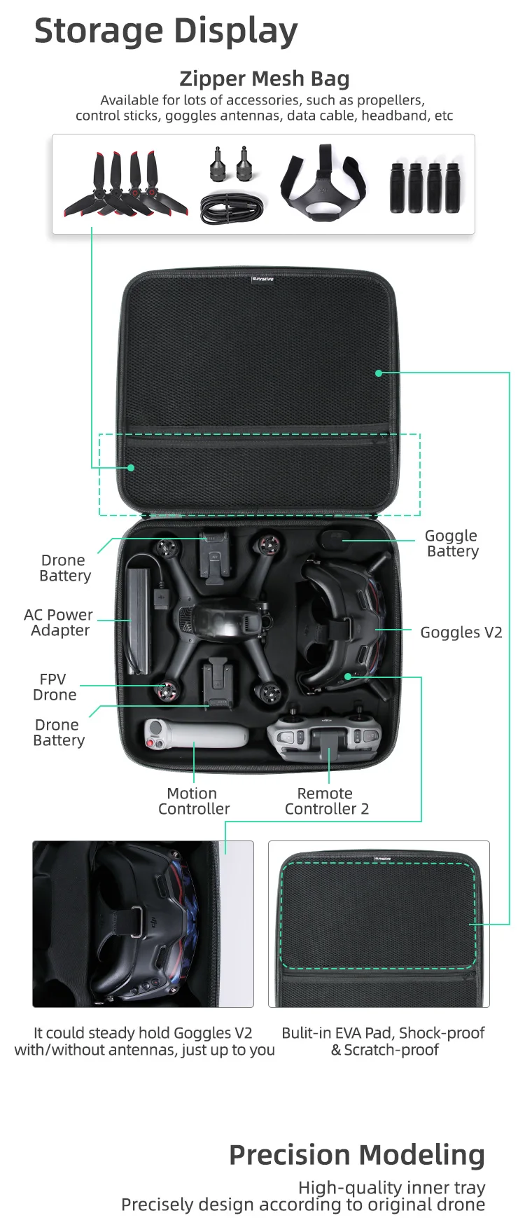 -The bag could hold FPV Drone, Goggles V2, Remote Controller 2, Motion Controller,